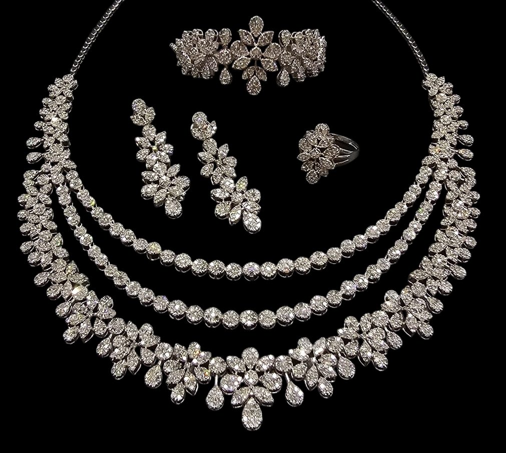 Description : One 18K White Gold Set Consisting of One Necklace , One Bracelet, One Pair of Earrings and One Ring Studded With Diamonds Total Est.Weight 17.10 carat , Weighing in Total 47.60 grams. ,Containing.